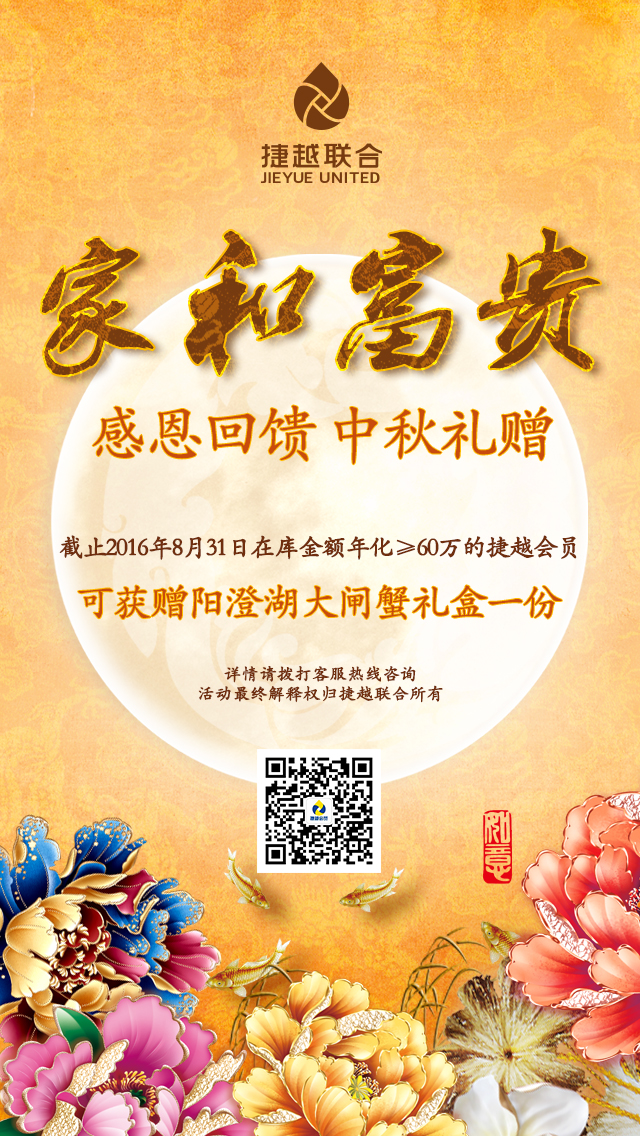 2016中秋佳节到来之际,为了回馈捷越会员长久以来的支持,华体网页版-华体(中国)客户服务中心特举办“家·和·富·贵”2016捷越会员中秋礼赠活动。截止2016年8月31日在库金额年化≥60万的会员即可获赠价值888元的阳澄湖大闸蟹礼盒一份!