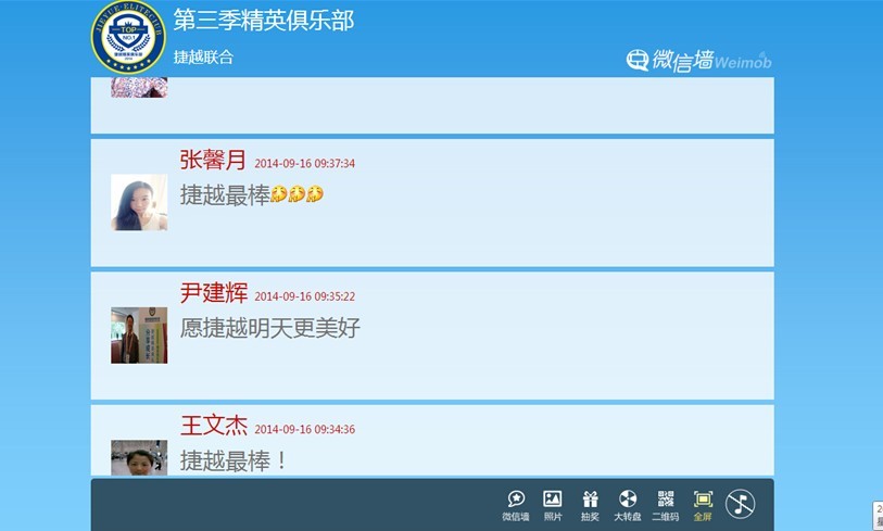 活动现场的“微信墙”则给精英们带来了心灵的触动。简单“扫一扫”华体网页版-华体(中国)的二维码,就可通过投影将自己的观点、心声与建议上墙,大家可以分享观点,分享心灵的触动。在此环节,精英们纷纷将心中的感慨发布到微信墙上与大家分享,真诚的话语几度让人落泪。精英们表示,捷越是个大家庭,领导的关怀,同事的关心总是感染着他们,但感动的话语却没有表达的途径,“微信墙”的出现让他们有了情感宣泄的“出口”,使他们能够将心中的话语表达出来。