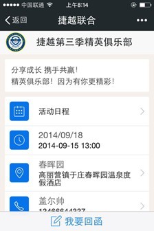 精英们说在他们没有跨入“精英俱乐部”大门之前,他们就已经体验到了捷越总部的贴心与创新,以往他们收到的只是一条短信邀请,这次他们收到的却是别具心裁的“微邀请函”,只需输入“精英”两个字,他们就能看到第三季精英俱乐部电子邀请函,活动时间、地点、日程安排、航班号一应俱全。