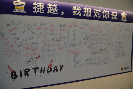 上午九时,简单而充满意义的“捷越,我想对你说”主题周年庆活动正式开始。当同事们像往常一样跨出电梯准备上班,看到昔日的办公职场像被施了神奇的魔法一样,变得充满欢乐祥和的节日气氛时,脸上无不露出惊奇与喜悦。随即工作人员递上精美的捷越生日蛋糕,同事们纷纷在背景板上写下祝福的话语并一同合影留念。