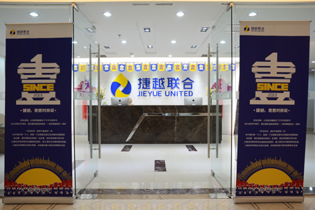 2014年6月18日,北京捷越总部银河SOHO大厦10层的办公区内挂满了庆祝捷越一周年的道旗、海报,进门处摆好易拉宝展架,电梯间内设置了签到背景版,充满了浓郁的喜庆气氛。