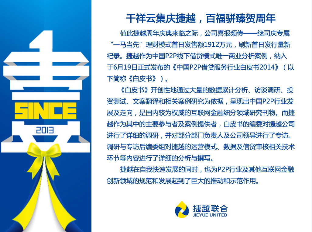 值此捷越周年庆典来临之际,公司喜报频传——继司庆专属“一马当先”理财模式首日发售额1912万元,刷新首日发行量新纪录。捷越作为中国P2P线下借贷模式唯一商业分析案例,纳入于6月19日正式发布的《中国P2P借贷服务行业白皮书2014》(以下简称《白皮书》)